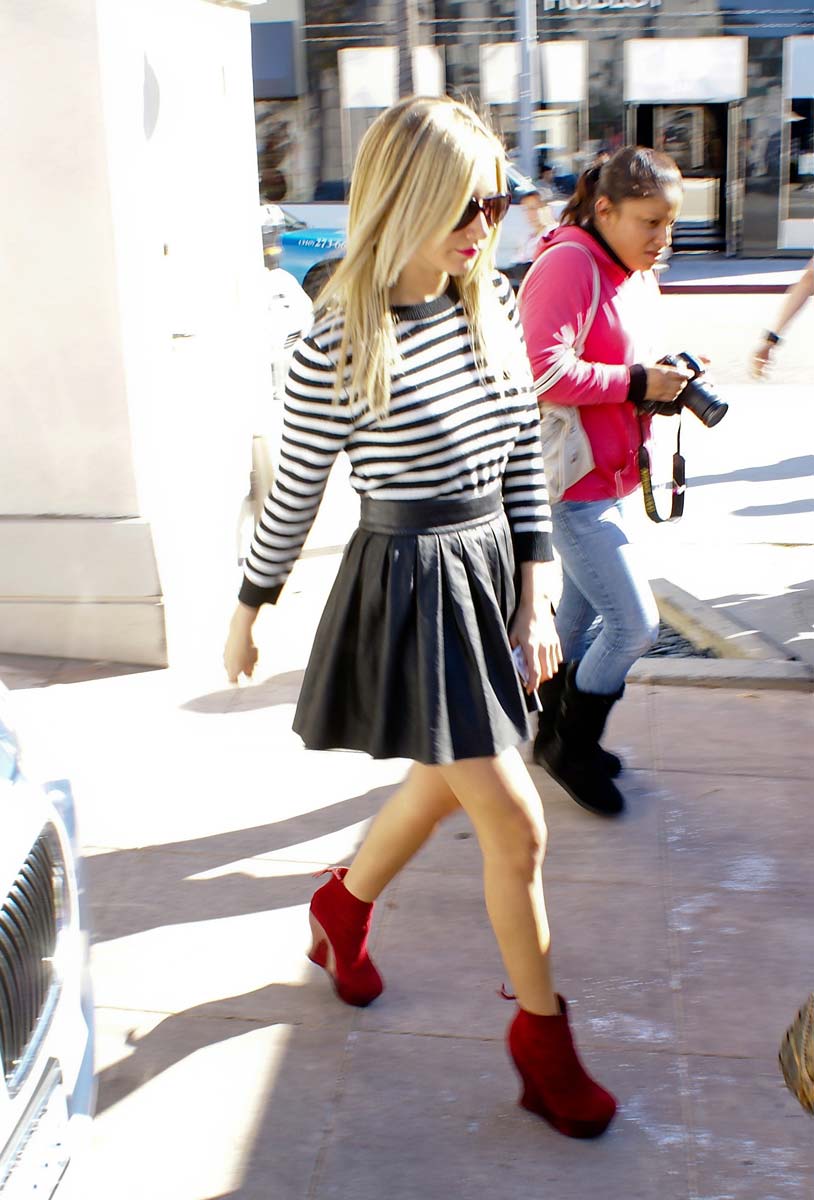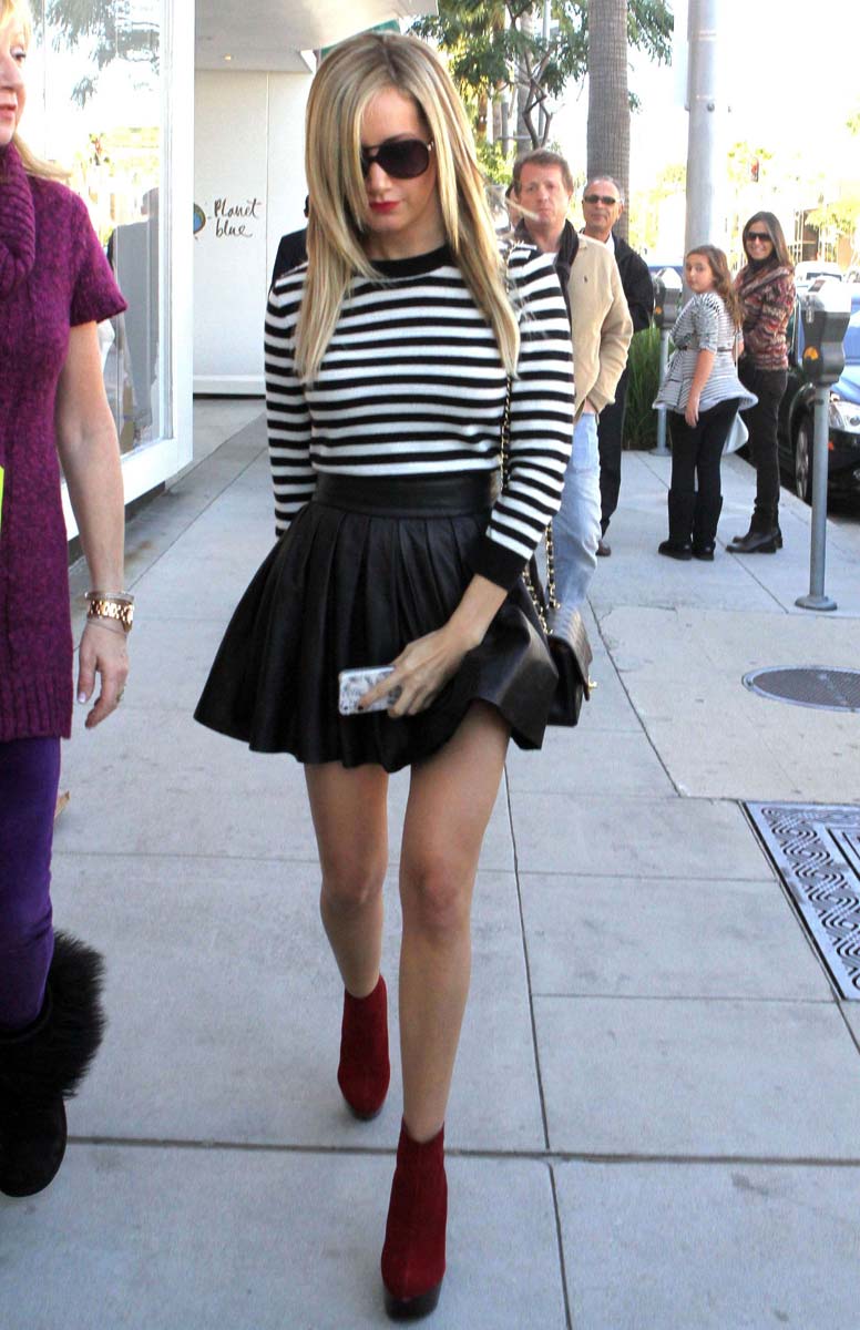 How Ashley Tisdale is still relevant is beyond me, I don’t know what’s going on anymore. If a mousy chick like this can still get all this attention, the stripper who spent about two and a half hours on my lap last night should be a superstar. I love fake boobies. Anyhow, here she is in her little leather skirt showing off some skin. Not bad. She’s still not ready to work the pole, but it’s a start.