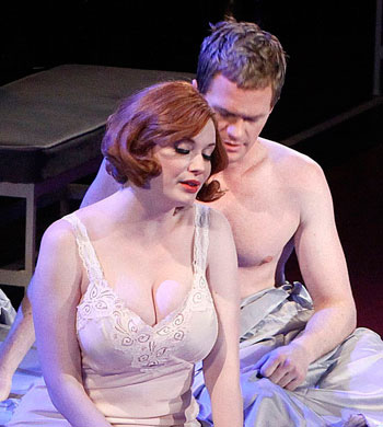 Here are some pictures of Christina Hendricks showing off cleavage in hot lingerie on stage for something I don’t know what. If I knew I would go to this epic chest spectacle! You know that I am not a big fan of her weird face, but those Christina Hendricks hot boobies can make this guy gay who does a scene with her becom a straight. Enjoy the show