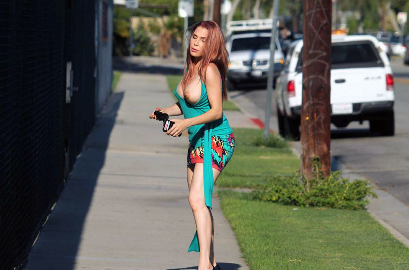 And look how clumsy Erika Jordan is! She was walking down the street and out of nowhere her tit slipped. She tried to keep it one place, but didn’t manage to do it! Scroll down to see it!
