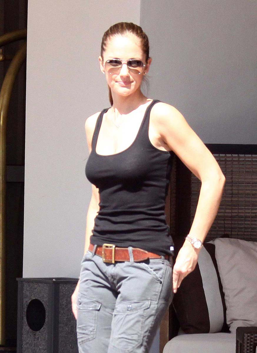 I already mentioned that Minka Kelly is rising to the top of my hottest Hollywood harlot list very rapidly and these pictures can confirm you that. Here she is on set of ‘Charlie’s Angels’ in Miami in her tight pants and tank top looking apsolutely fucking amazing. Although unfortunately we only have a small peek at her nipples I still like how Minka Kelly boobs look in that tank top. I hope that soon will be some beach scenes in which we will be able to see some Minka Kelly bikini action. Enjoy