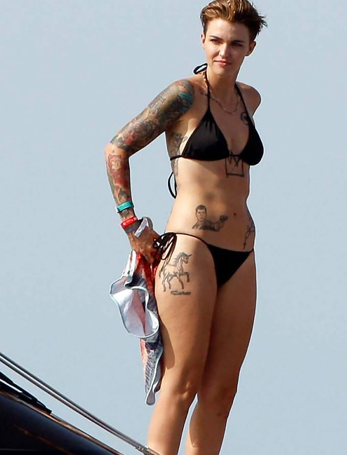 Abs, boobs and tattoos, is the perfect description of Ruby Rose nude. It would be a shame for you to not see this gentle body and the Australian actress knows how to strike a pose. Hairless, superb form of her boobs and ass is gonna make you go crazy over this hotshot! Peachy pink pussy can be seen in these pictures of Ruby Rose nude.