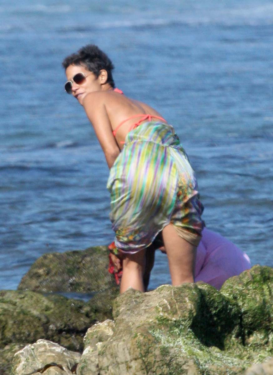 Here is Halle Berry prancing around in her little bikini top and having fun with her friends while celebrating her 45 birthday at the beach in Malibu and as you can see she is looking drop dead sexy and busty while doing so. Holy awesome bikini cleavage Batman! … Can you believe this woman just turned 45?… I mean look at that amazing body of hers. She is just to damn amazing  and her body is too damn hot and tight for her to be that old. She’s sure hiding thos years well. Enjoy this Halle Berry bikini gallery.