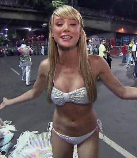 I do not know if these pictures of Sara Jean Underwood new, but here she is filming scenes for some show in Rio on Carnivale or at some party that involves a bunch of Brazilian chicks shaking their asses in little thongs, so they are probably old. I think that nobody cares. The only important thing is that here I have Sara Jean Underwood and her big fake boobs stuffed in a little bikini. I hope that we will be able to see the rest, intending her to join the girls and shake her hot little booty.